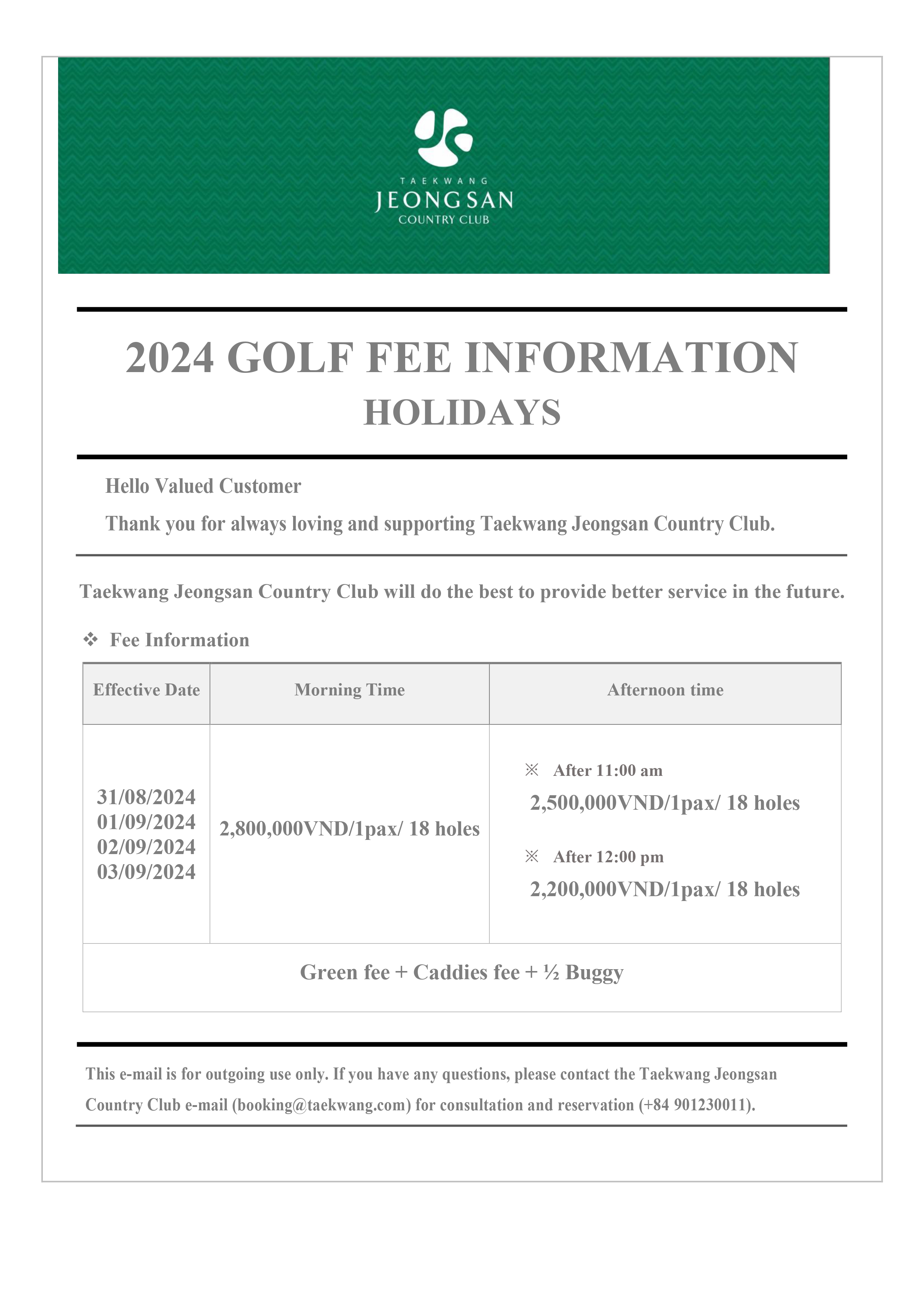 GOLF FEE 2024 - HOLIDAYS (31.08.2024-03.09.2024)
